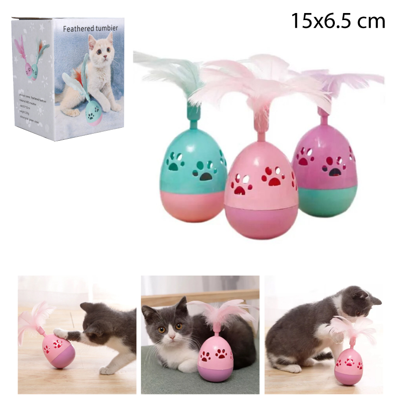 Juguete para gatos con diseño de pluma y cascabel dentro del juguete, incluye contrapeso para mantenerse en pie y el juego sea más didáctico para el felino.
